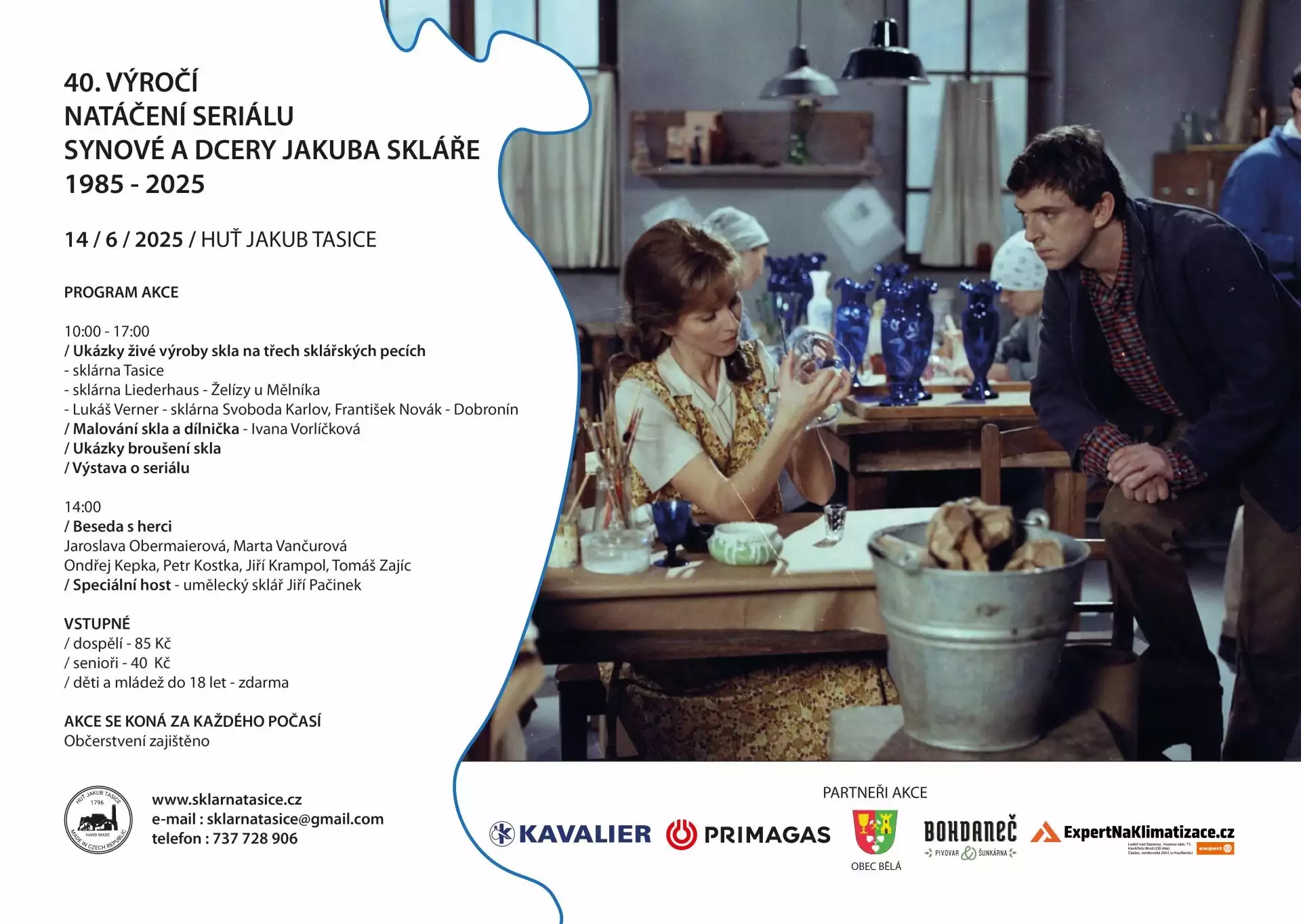 Zveme Vás na oslavu 40. výročí natáčení seriálu Synové a dcery Jakuba Skláře ve sklárně Tasice! Těšte se na den plný fascinujících okamžiků, kdy budete moci nahlédnout do uměleckého řemesla