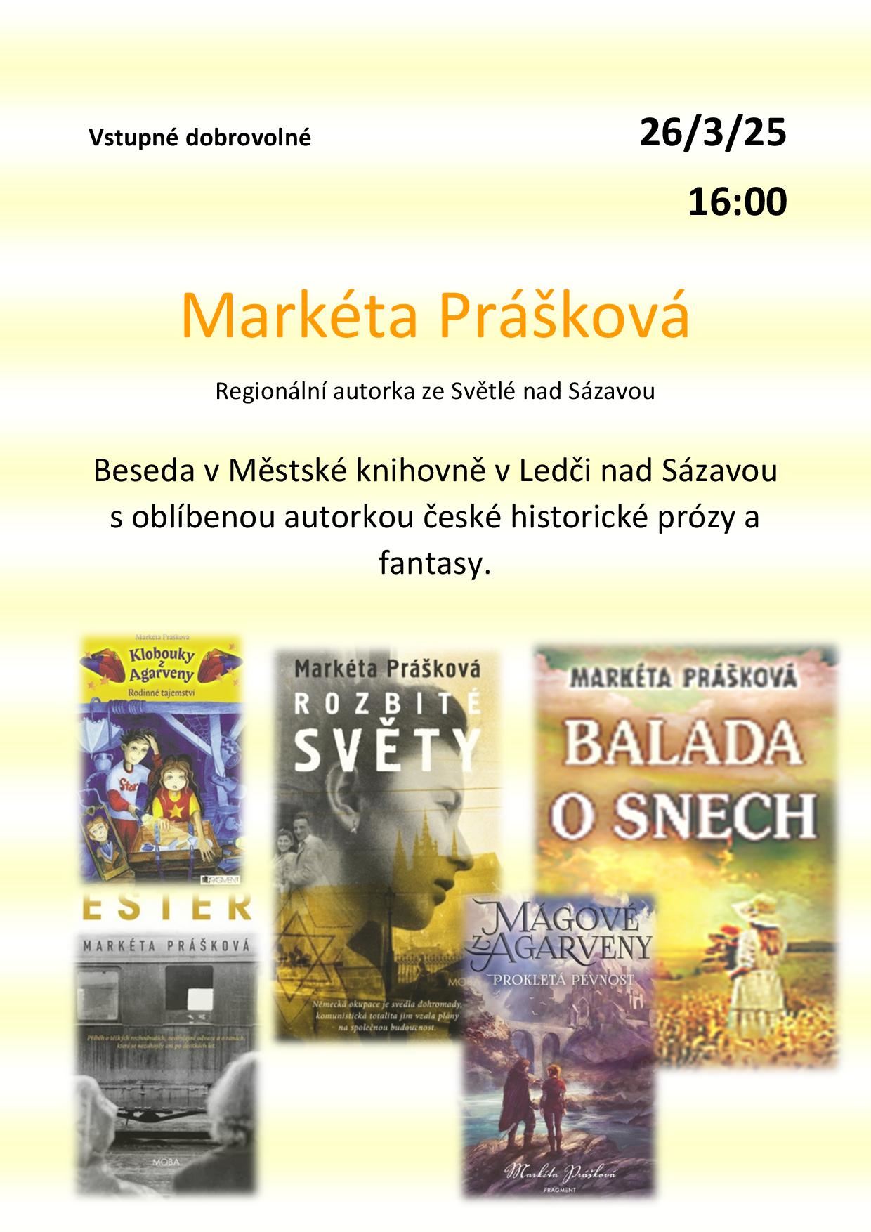 Beseda s reionální autorkou Markétou Práškovou, píšící píšící českou historickou prózu a fantasy se uskuteční 26.3. v Městské kninovně.