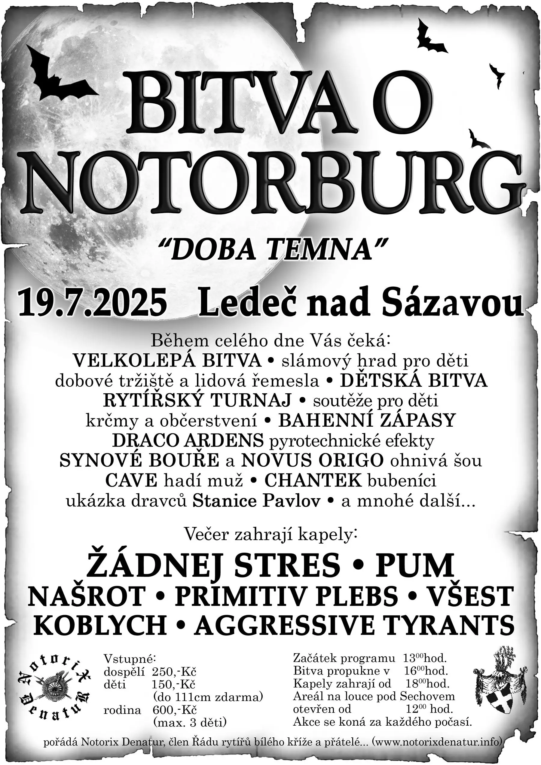 Přidat do oblíbenýchSrdečně Vás zveme na velkolepou bitvu o Notorburg u Ledče nad Sázavou, která letos slaví už 22. ročník! (Přesné místo konání je na louce pod obcí Sechov)