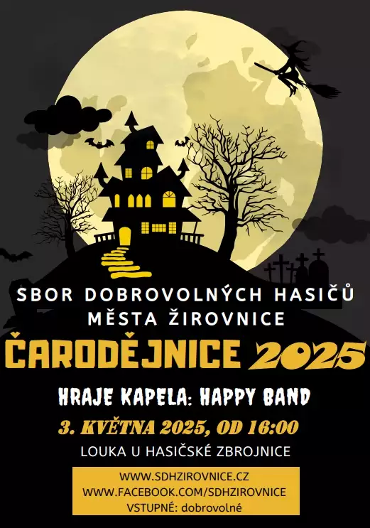 Poslední dubnový den patří tradičnímu pálení čarodějnic, ale v Žirovnice se budou čarodějnice pálit až o pár dní později a to 3. května. O dobou zábavu se postará kapela HAPPY BAND a chybět nebude ani pestrý zábavný program pro všechny!