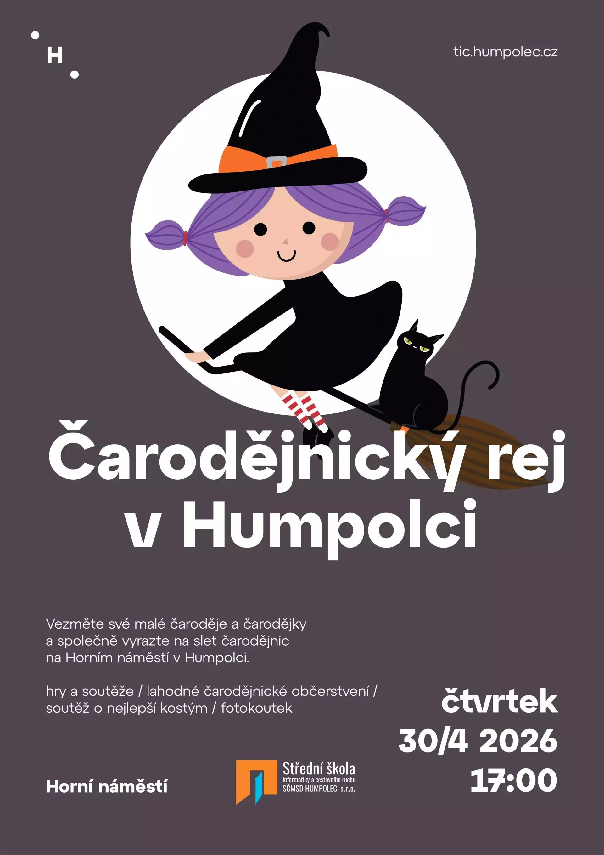 Vezměte své malé čaroděje a čarodějky a společně vyrazte na slet čarodějnic na Horním náměstí v Humpolci. Těšit se můžete na pestrý program plný her a soutěží, čeká vás také soutěž o nejlepší kostým a možnost zachytit kouzelné okamžiky ve fotokoutku.