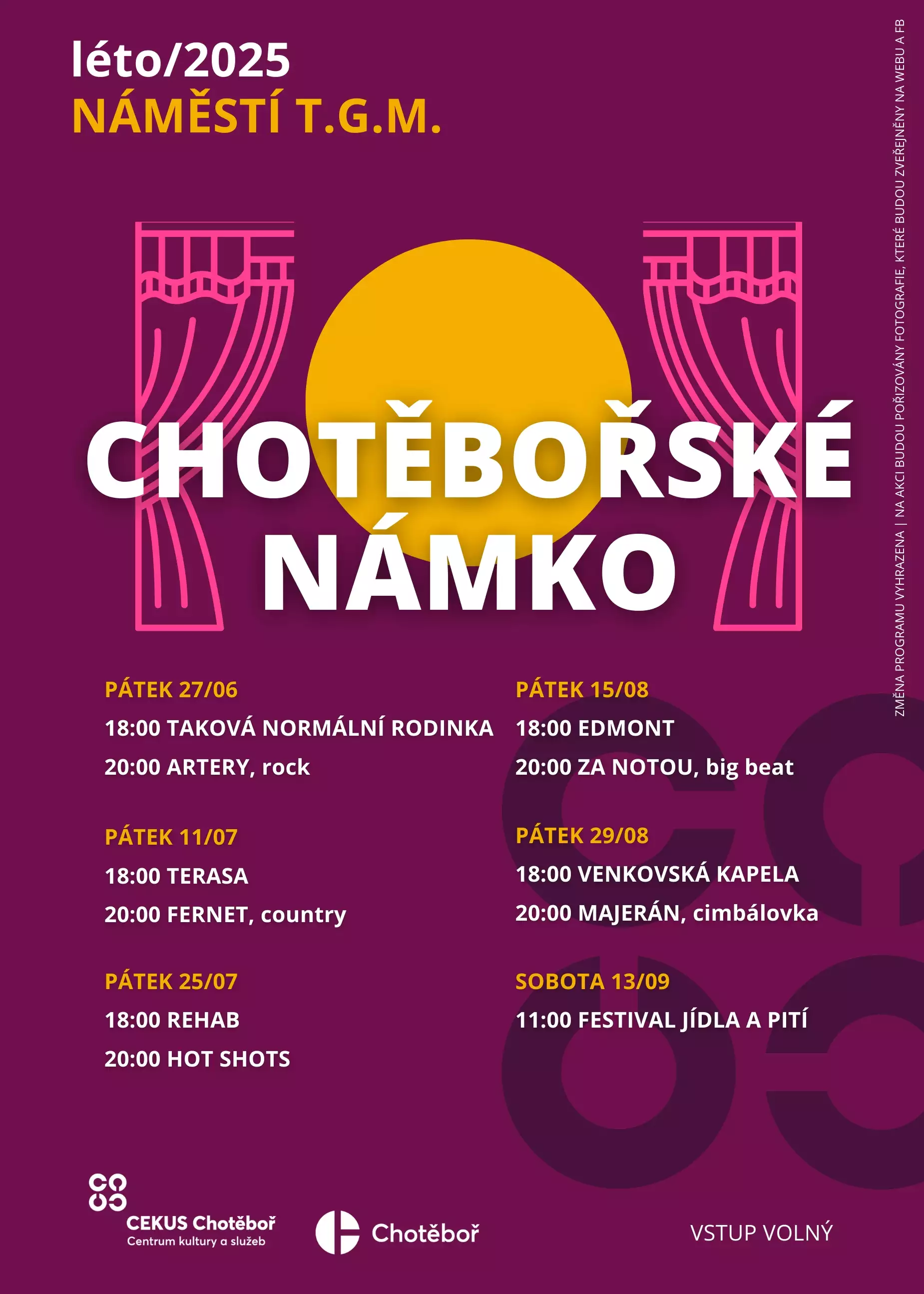 Chotěbořské náměstí ožije a nabídne pestrý kulturní program během pátečních prázdninových večerů. Těšit se můžete na vystoupní různých kapel a celý projekt zakončí festival jídla a pití.