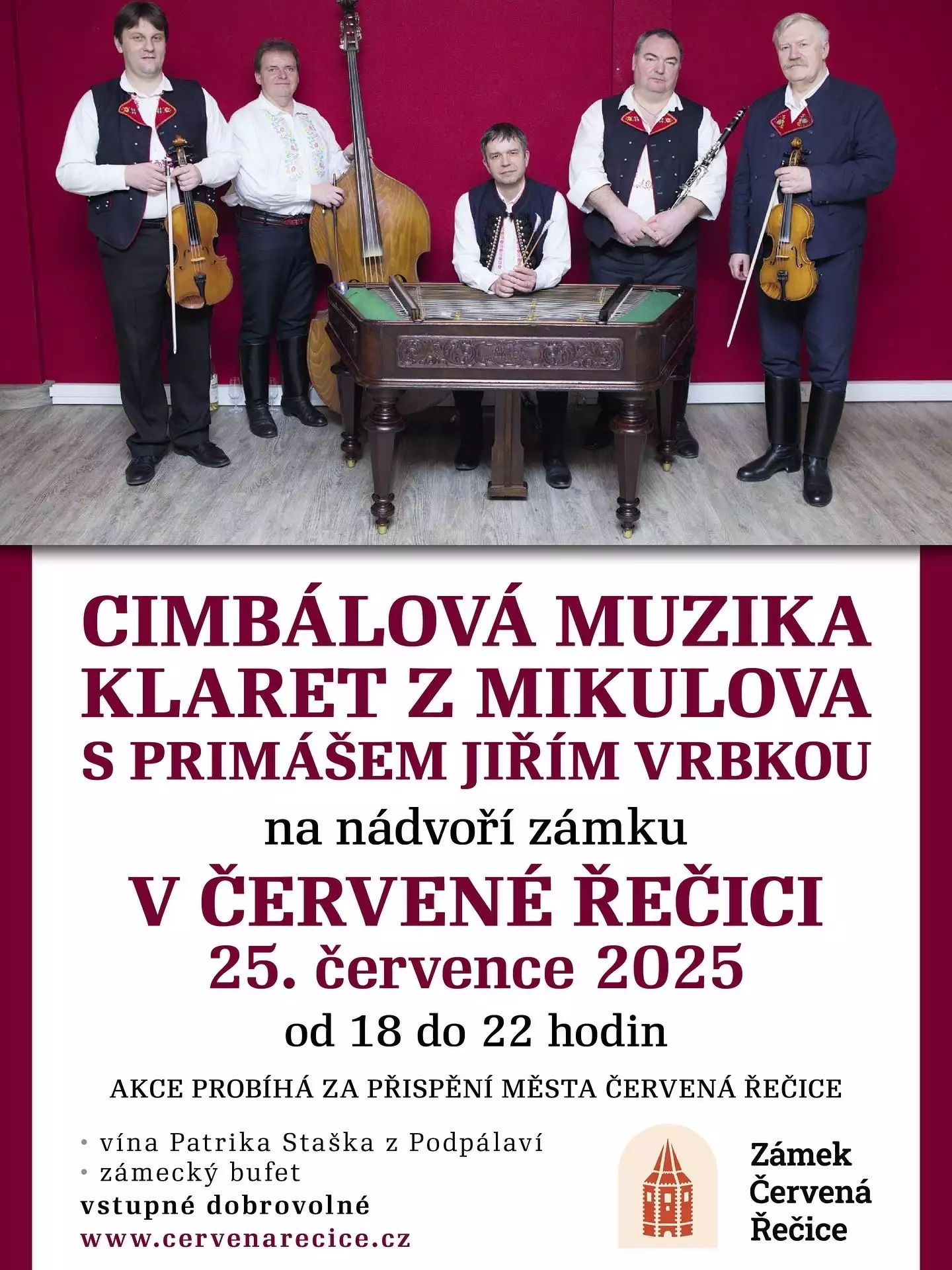 Cimbálová muzika Klaret z Mikulova pod vedením primáše Jiřího Vrbky rrozezní své struny v letní podvečer na Zámku Červená Řečice. Nebudu chybět velký výběr moravských vín z vinic pod Pálavou o ktčerý se postará Patrik Staško.