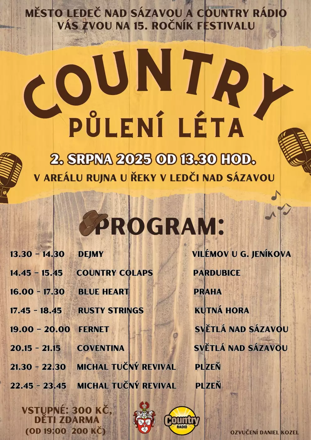 Na pódiu vystoupí řada skvělých interpretů, včetně DEJMY, COUNTRY COLAPS, BLUE HEART, RUSTY STRINGS, FERNET COVENTINA a MICHAL TUČNÝ REVIVAL.
