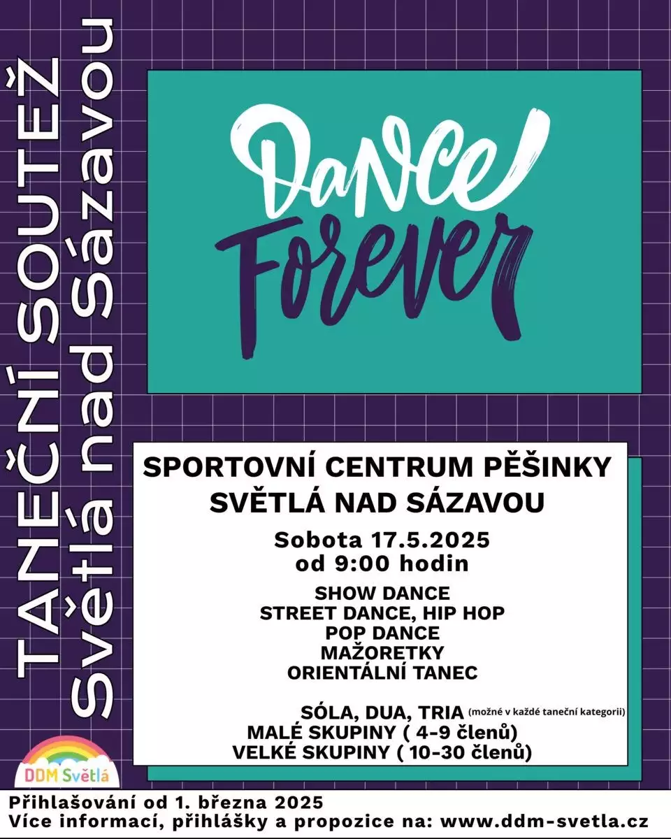 Velká taneční soutěž je tady a bude se konat ve Světlé nad Sázavou. Přijďte fanndit nadaným tanečníkům, kteří se představí v různých tanečních kategoriích.