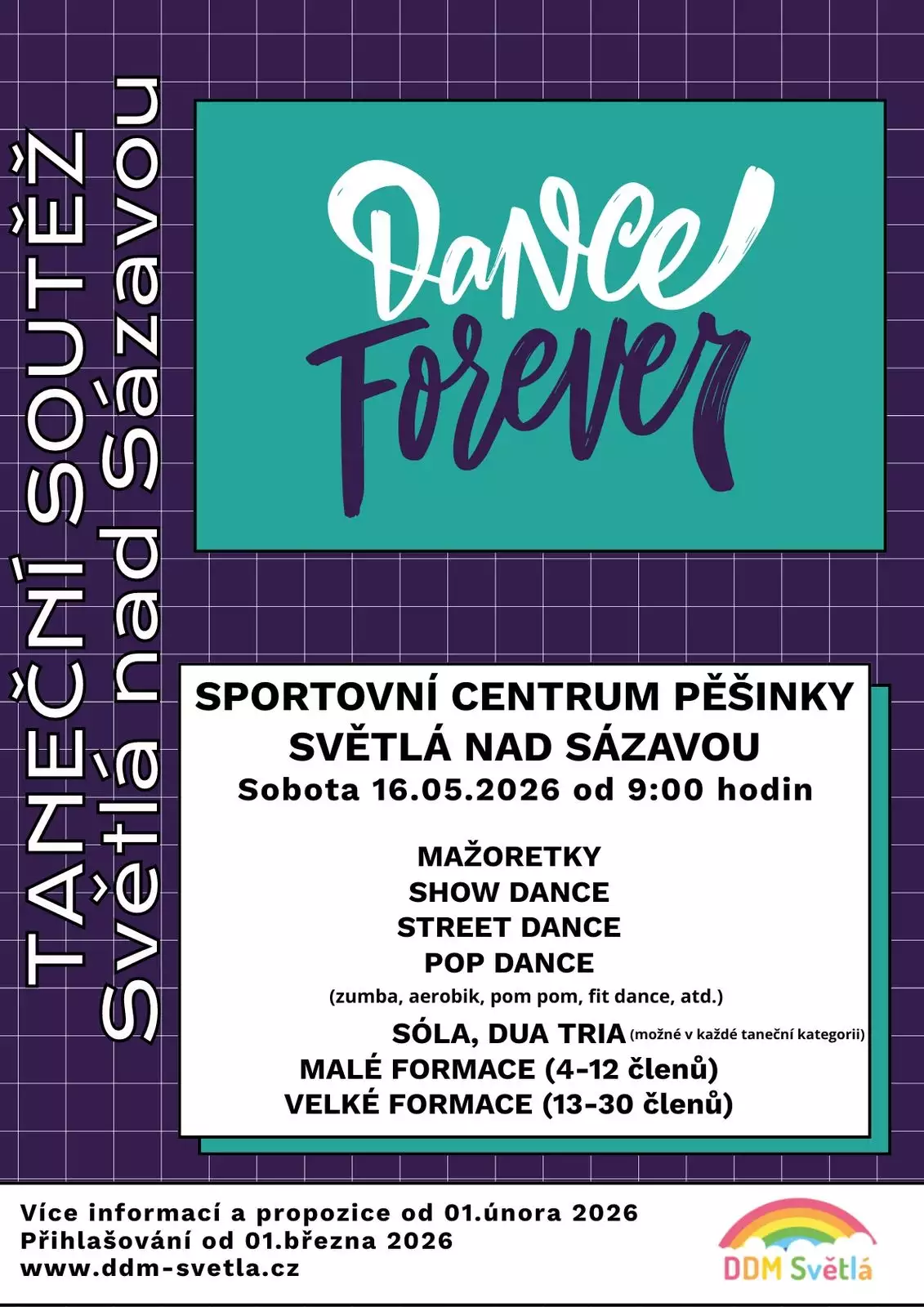 Věříme, že si den plný tance užijete stejně naplno, jako přihlášení tanečníci, protože to bude skvělá podívaná v různých tanečních kategoriích. Představí se tanečníci v discotancích, street dancu, pop dancu, zumbě, orientálních tancích, nebude chybět výrazový tanec a mnoho dalších kategorií.