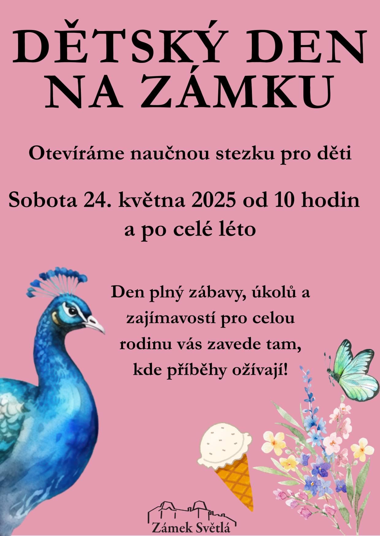 Návštěvníci se mohou těšit na slavnostní otevření nové naučné stezky pro děti, která zábavnou formou přibližuje přírodu, rostliny a živočichy, kteří nás obklopují. Každý krok stezky přináší nové výzvy v podobě hádanek a úkolů, objevování i radost z pohybu. Zámecká kavárna nabídne lahodnou zmrzlinu a další občerstvení, které zpříjemní váš čas strávený na zámku.