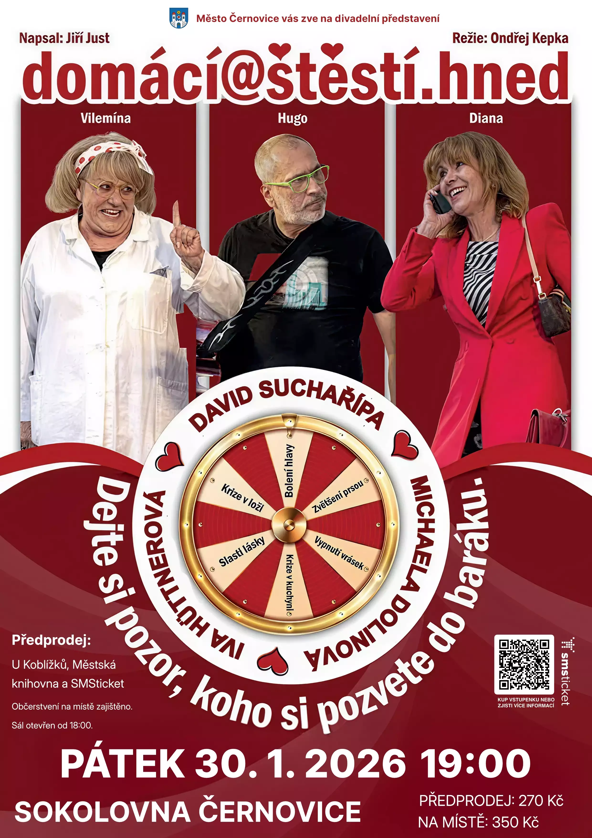 Přijďte shlednout divadelní představení, těšit se můžete na Ivu Hüttnerovou, Davida Suchařípu a Michaelu Dolinovou.