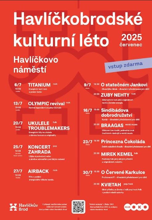 Srdečně vás zveme na další ročník oblíbeného Havlíčkobrodského kulturního léta, který se v roce 2025 odehraje na Havlíčkově náměstí a v zahradě Staré radnice. Těšit se můžete na pestrou paletu hudebních i divadelních vystoupení, kapely oceněné Cenou Anděl, koncertní objevy i slavné revivaly a pohádková představení pro děti. Všechny akce jsou pro návštěvníky zcela zdarma!