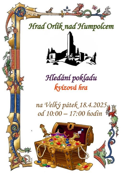 Udělejte si výlet na Velký pátek a přijďte na Orlík! Pro dětské i dospělé návštěvníky hradu je je připravena pohádková kvízová hra. Po správném vyluštění se otevře truhla s pokladem a budete si moci něco z tohoto něco uzmout do svého vlastnictví. Budeme se těšit na viděnou.