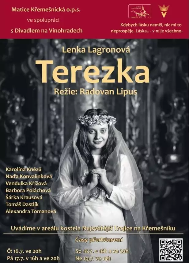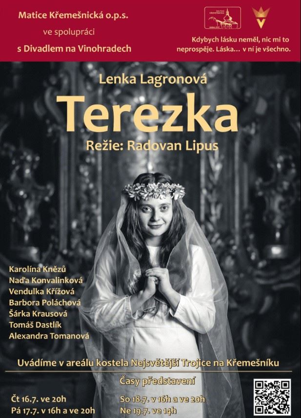 Hra Terezka autorky Lenky Lagronové vychází ze života svaté Terezie z Lisieux a sleduje její cestu od dětství v milující rodině přes bolestnou ztrátu matky až k rozhodnutí vstoupit do kláštera a hledat vlastní duchovní poslání.