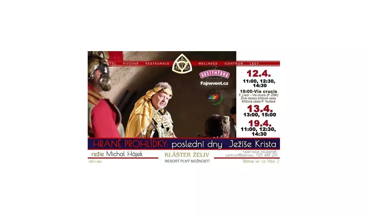 Tato unikátní inscenace v režii Michala Hájka a v podání herců z FajnEventu si společně kladou otázku: Kdo může za smrt Ježíše Krista? Příběh, který zná snad každý, je přetvořen do netradičního interaktivního formátu, kde se návštěvníci stávají součástí děje. Nejenže se ocitnete tváří v tvář strhujícím výkonům pěti herců, ale budete mít možnost vstoupit do příběhu a dotknout se pocitů každé z postav. Pašijové hry – Poslední dny Krista nejsou jen obyčejnou divadelní hrou, jsou cestou, jak prožít velikonoční příběh intenzivněji a osobněji.