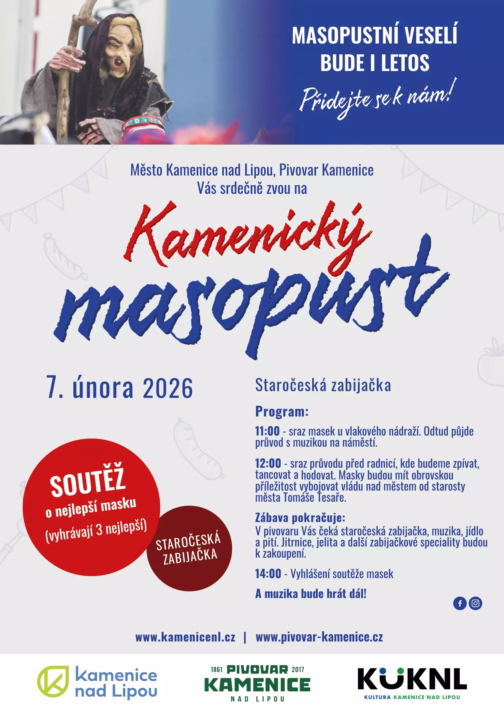 Přidat do oblíbenýchMasopustní čas nastal! Čeká nás průvod masek, hudba, tanec a poctivé masopustní dobroty.