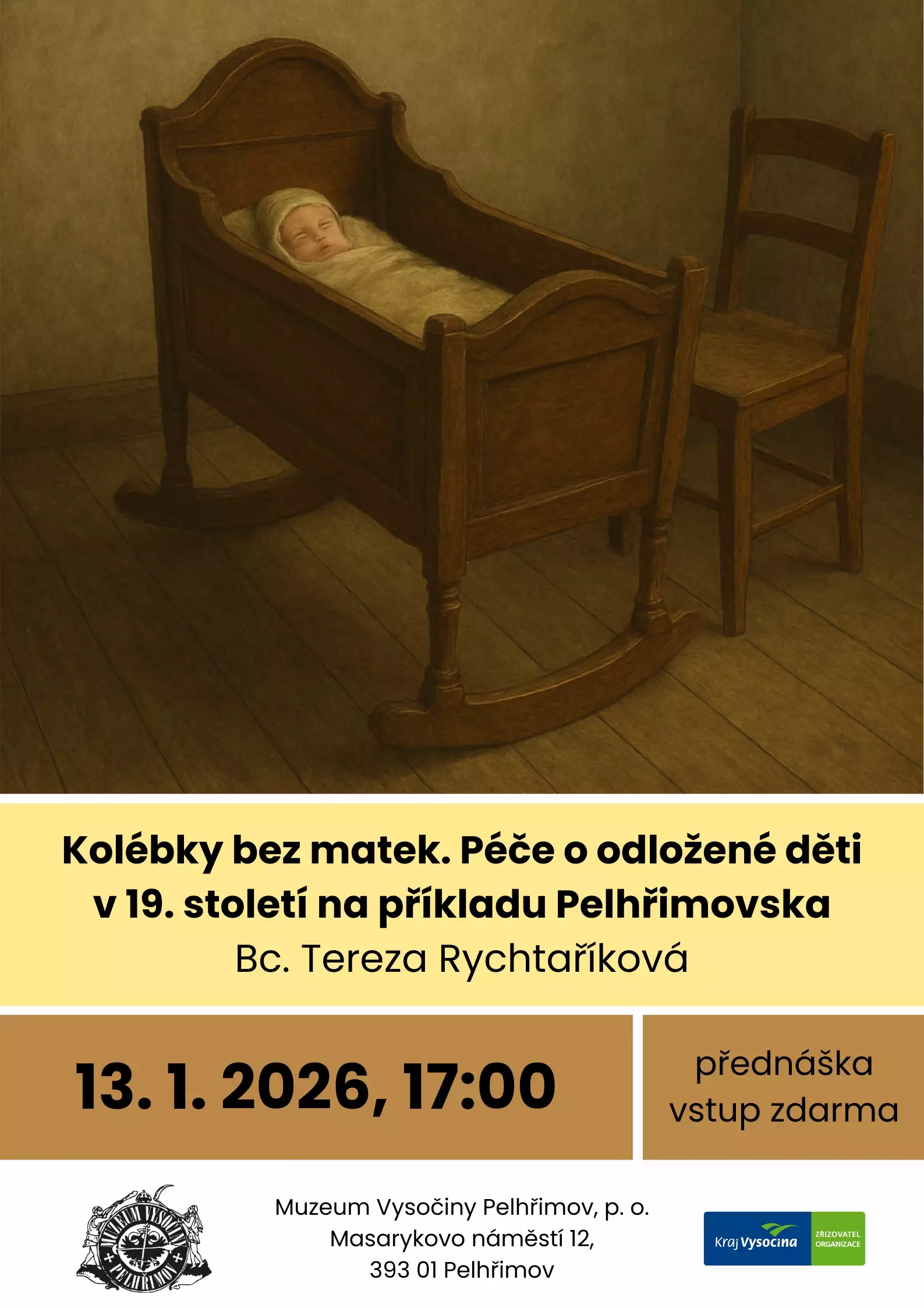 Pod názvem „Kolébky bez matek“ se skrývá málo známý svět odložených dětí. Jaké to bylo narodit se v 19. století jako dítě, kterého se jeho matka rozhodla, ať už dobrovolně či nedobrovolně, vzdát? Kdo a jaké instituce zajistily péči o tyto nalezence? Byla takováto forma pomoci dostatečná? Jaké měla nedostatky? A jaké byly konkrétní příběhy nalezenců z oblasti Pelhřimovska? Na tyto otázky se pokusí odpovědět tato přednáška.