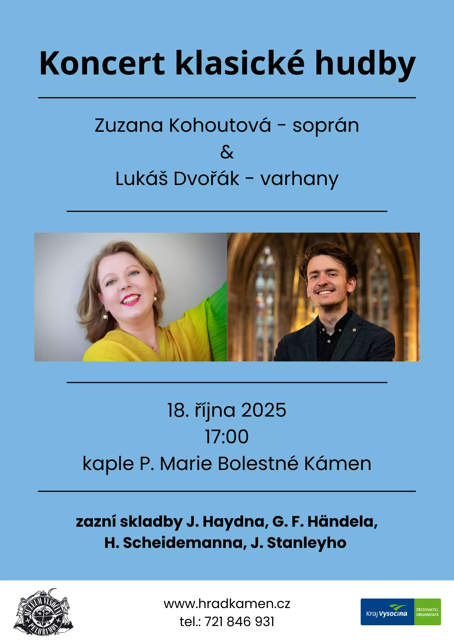 Srdečně vás zveme na mimořádný koncert klasické hudby, který se uskuteční v prostorách kaple Panny Marie Bolestné v Kámeně. V jedinečné akustice kaple zazní výběr duchovní i operní hudby v podání sopranistky Zuzany Kohoutové a varhaníka Lukáše Dvořáka – dvou výrazných osobností současné české i mezinárodní hudební scény.