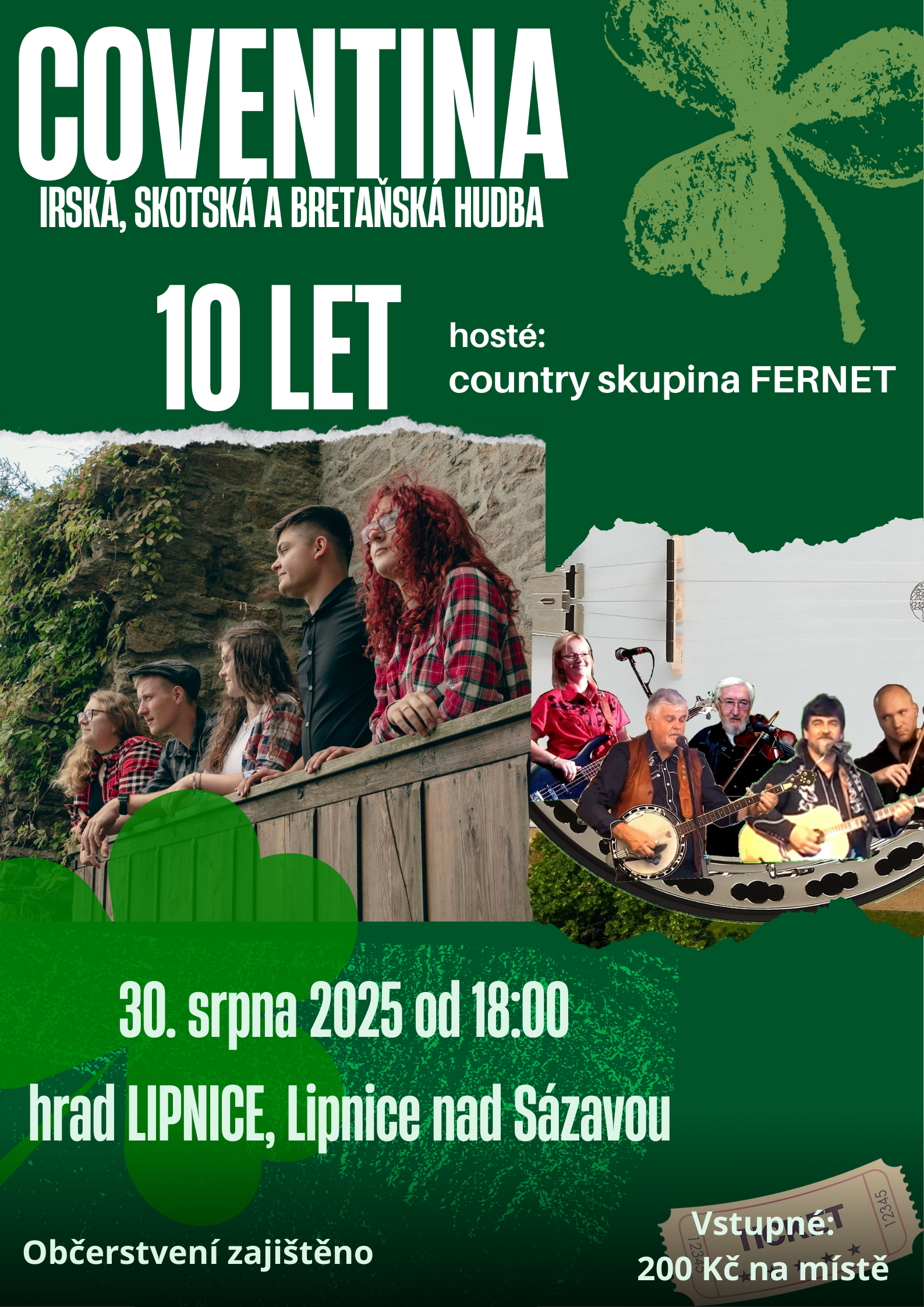 Trčkovým palácem se ponesou melodie irských, skotských a keltkých písní. Přijďte si užít konec prazdnin a poslechnout si koncert k desetiletému výročí skupiny Coventina ze Světlé nad Sázavou.