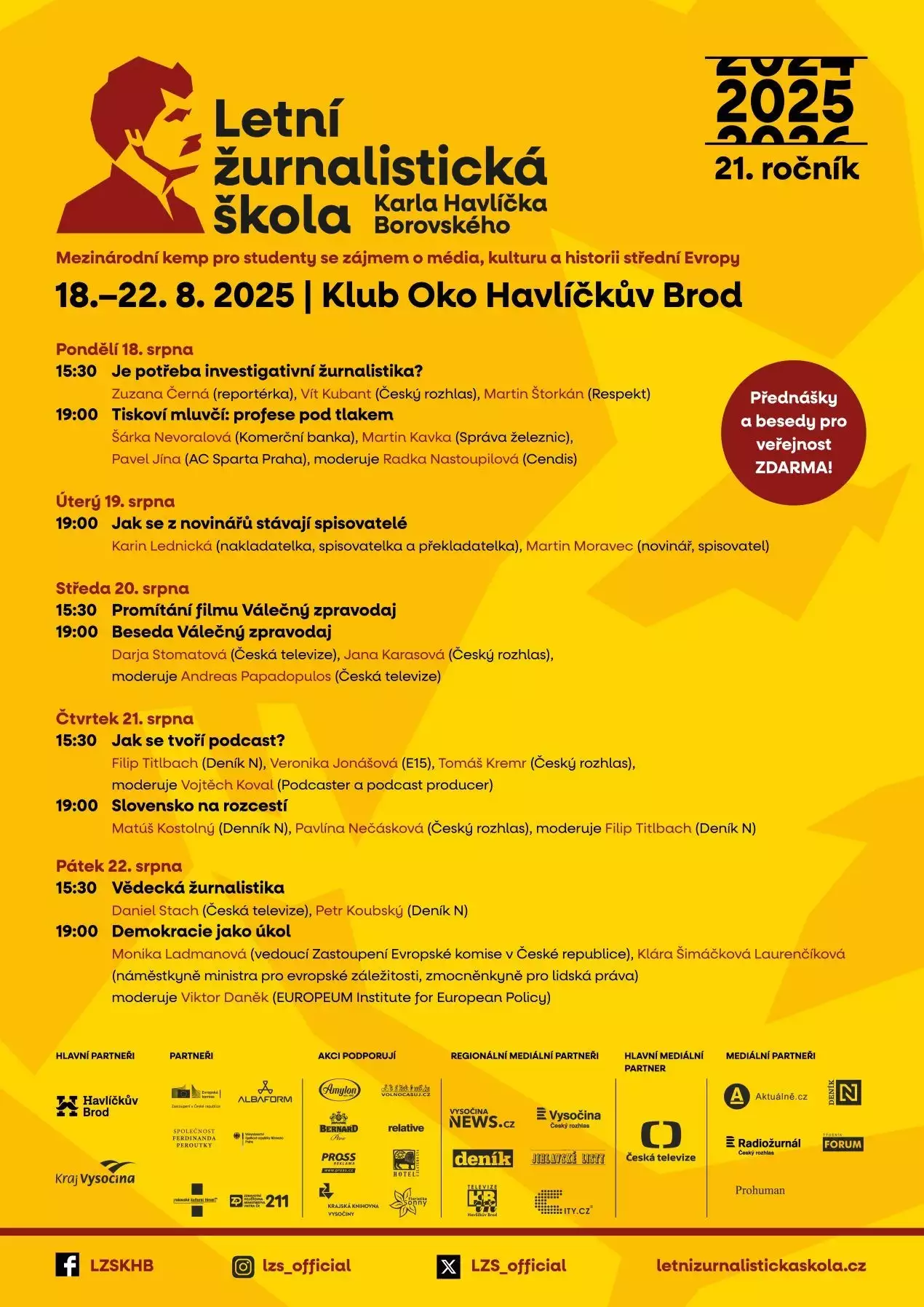 Přidat do oblíbenýchLetní žurnalistická škola Karla Havlíčka Borovského (dále jen LŽŠ) je týdenní kurz pro studenty středních a vysokých škol z Evropy. Hlavními tématy LŽŠ jsou historie, současnost, kultura a média střední Evropy, doplňují je další vybraná témata z oblasti žurnalistiky a etiky, účastníci se tak seznámí s prací novináře a fungováním médií. Hlavním komunikačním jazykem akce je čeština.