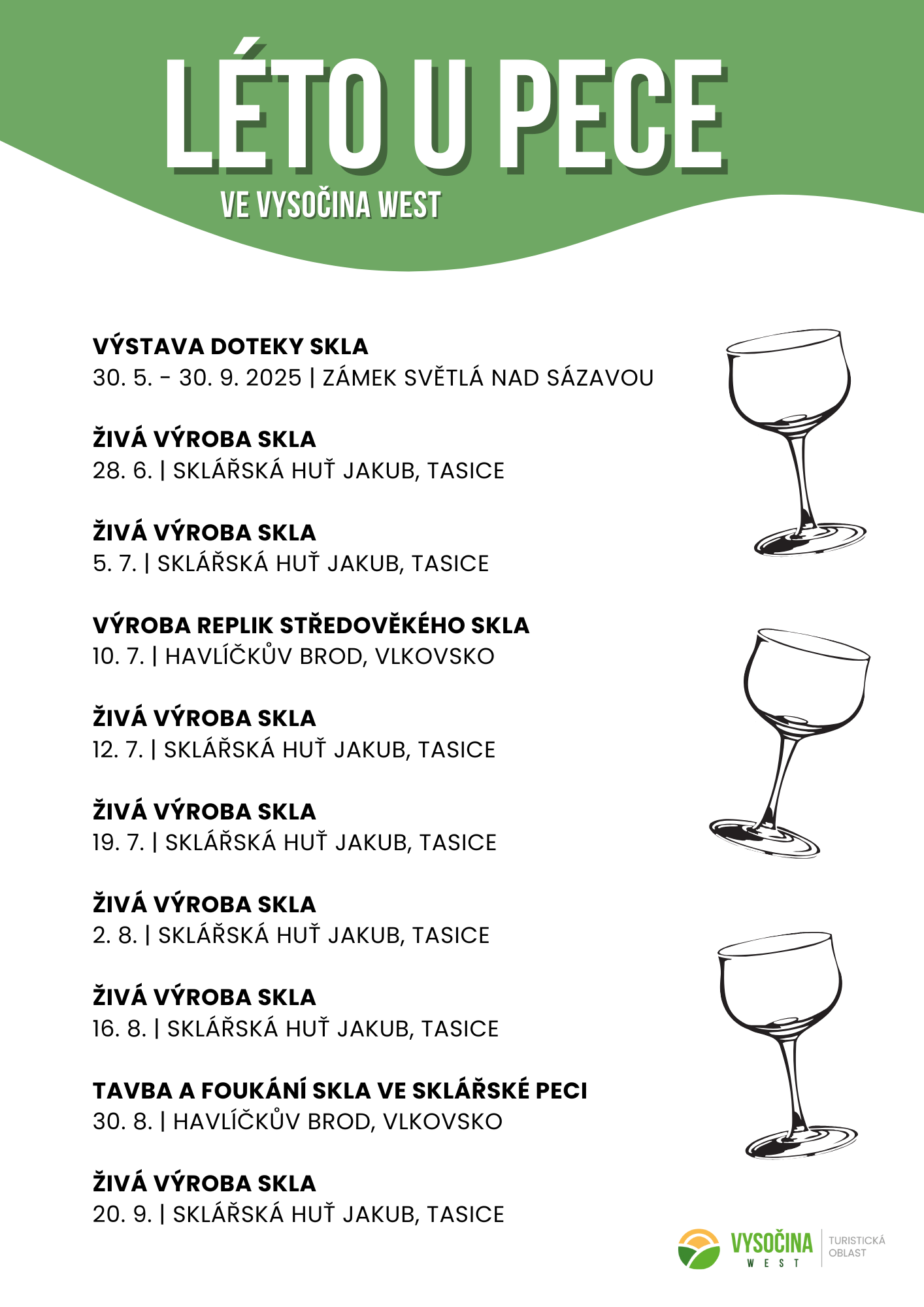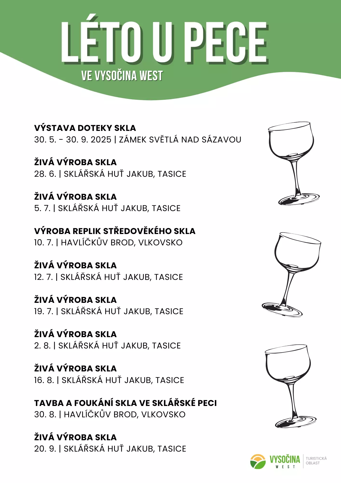 Sklářství má na Vysočině hluboké kořeny. Dodnes tu najdete místa, kde sklo vzniká tradičním způsobem – ručně, s respektem k řemeslu a přírodě. Užijte si LÉTO U PECE a zažijte živou historii skla i současnou tvorbu na Vysočině.