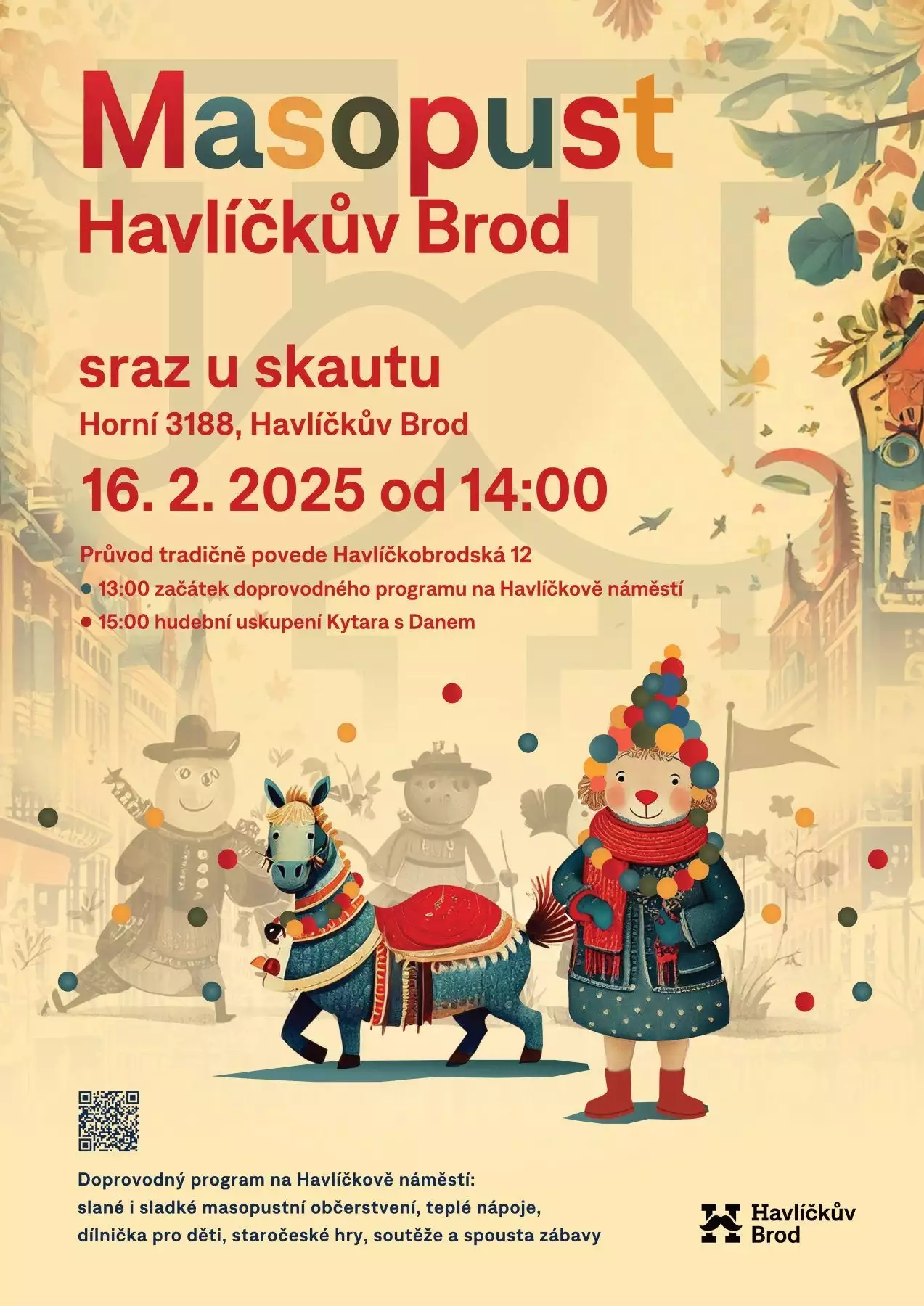 Ve 14:00 odstartuje Masopustní průvod z Horní ulice (od Skaut klubu). Průvod povede, jako již každý rok, Havlíčkobrodská 12. Těšit se můžete na pestrý výběr masek, staročeské tradice a nezapomenutelnou atmosféru.