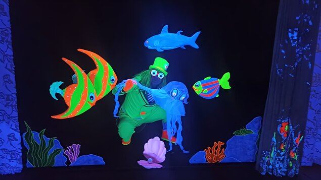 Zajímavostí této unikátních loutkové revue jsou černo-divadelní scény a loutky v nadživotní velikosti, které uvádějí v úžas nejen děti, ale i dospělé diváky. Komické dialogy se střídají s písničkami a soutěžemi, kterých se děti samy účastní. Aktivně jsou však do děje zapojeni všichni diváci. Jako hosté v ní vystoupí i známí kamarádi z televizní obrazovky, Jů a Hele.
