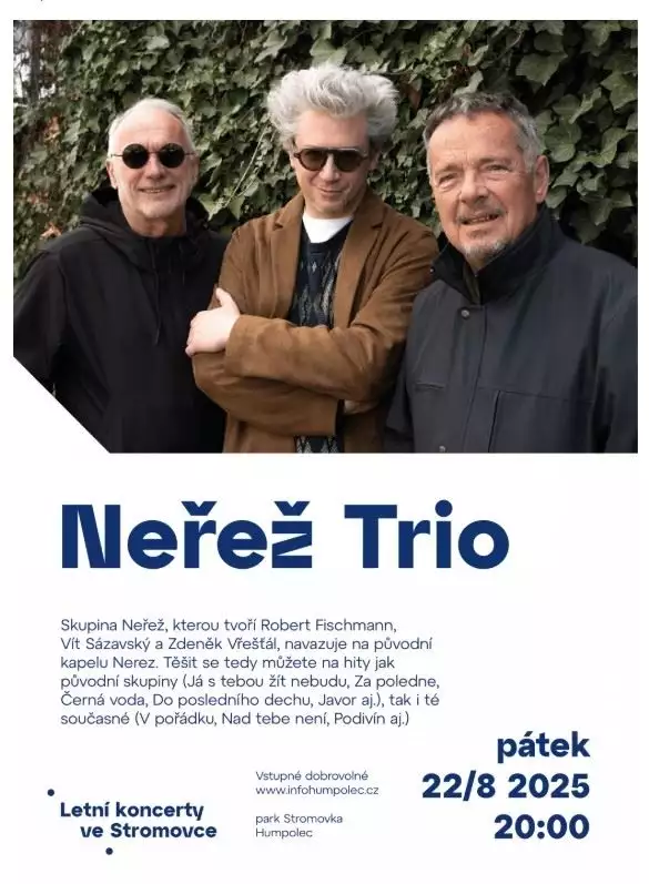 Skupina Neřež, kterou tvoří Robert Fischmann, Vít Sázavský a Zdeněk Vřešťál, navazuje na původní kapelu Nerez. Těšit se tedy můžete na hity jak původní skupiny (Já s tebou žít nebudu, Za poledne, Černá voda, Do posledního dechu, Javor aj.), tak i té současné (V pořádku, Nad tebe není, Podivín aj.)