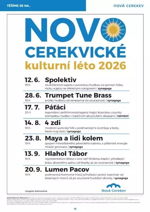 Synagoga v Nové Cerekvi se během léta stane kulturním centrem. V nádherných prostorách se zaposloucháte do tónů kapely Lumen Pacov - podmanivá harmonie hlasů přinášející pestrý repertoár od klasických mistrů až po současné hudební skvosty.