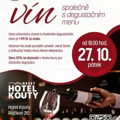 Pro všechny milovníky vína připravena v Hotelu Kouty výtečná ochutnávka různých druhý vína spolu s degustačním menu.Můžete se už nyní naladit: KDE: Hotel Kouty, Rejčkov 20, Dolní MěstoKDY: 27.10.2023 od 18 hod.