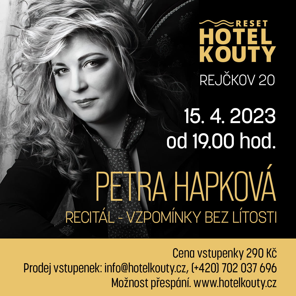 Přidat do oblíbenýchPetraHapková – „Recitál – Vzpomín bez lítosti“, se uskuteční 15. 4. 2023 v 19:00 hodin v Hotelu Kouty, Rejčkov 20.