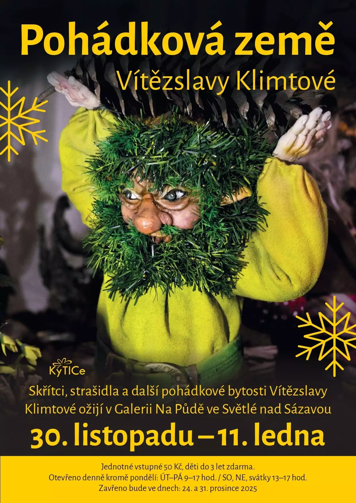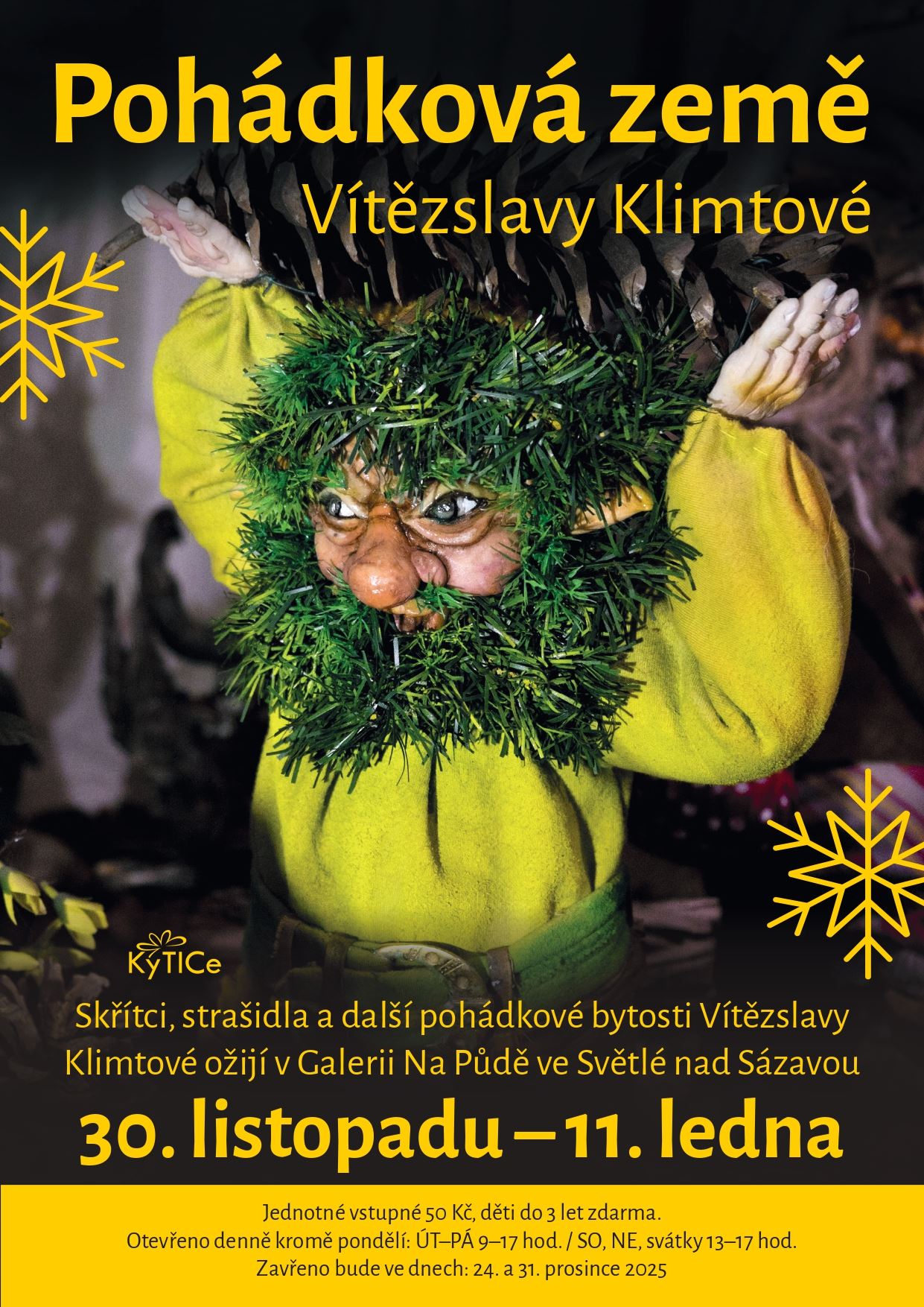 Skřítci, strašidla a další pohádkové bytosti Vítězslavy Klimtové ožijí v prostorách Galerie Na Půdě. Výstava kromě početné rodiny pohádkových postav čítající na 100 originálních loutek skřítků, vodníků, víl, rusalek i čertíků uvidíte také obrazy knižních ilustrací a můžete si namalovat kamínek v kamínkové dílně.