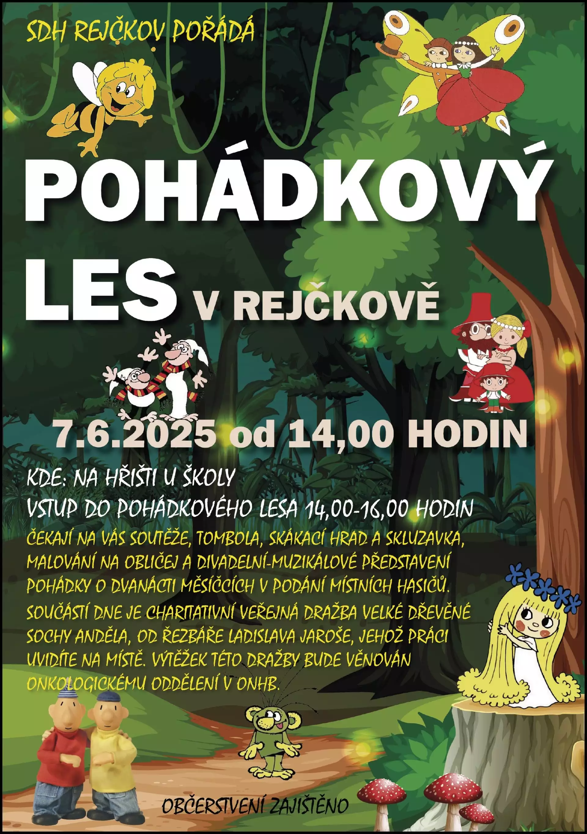 Pohádkový les se otevírá ve 14 :00 a zavírá v 16:00 Začátek cesty je je na hřišti u školy. Po projití lesa si užijte spoustu další zábavy. Čekají na vás soutěže, skákací hrad, malování na obličej a i občerstvení je zajištěno!