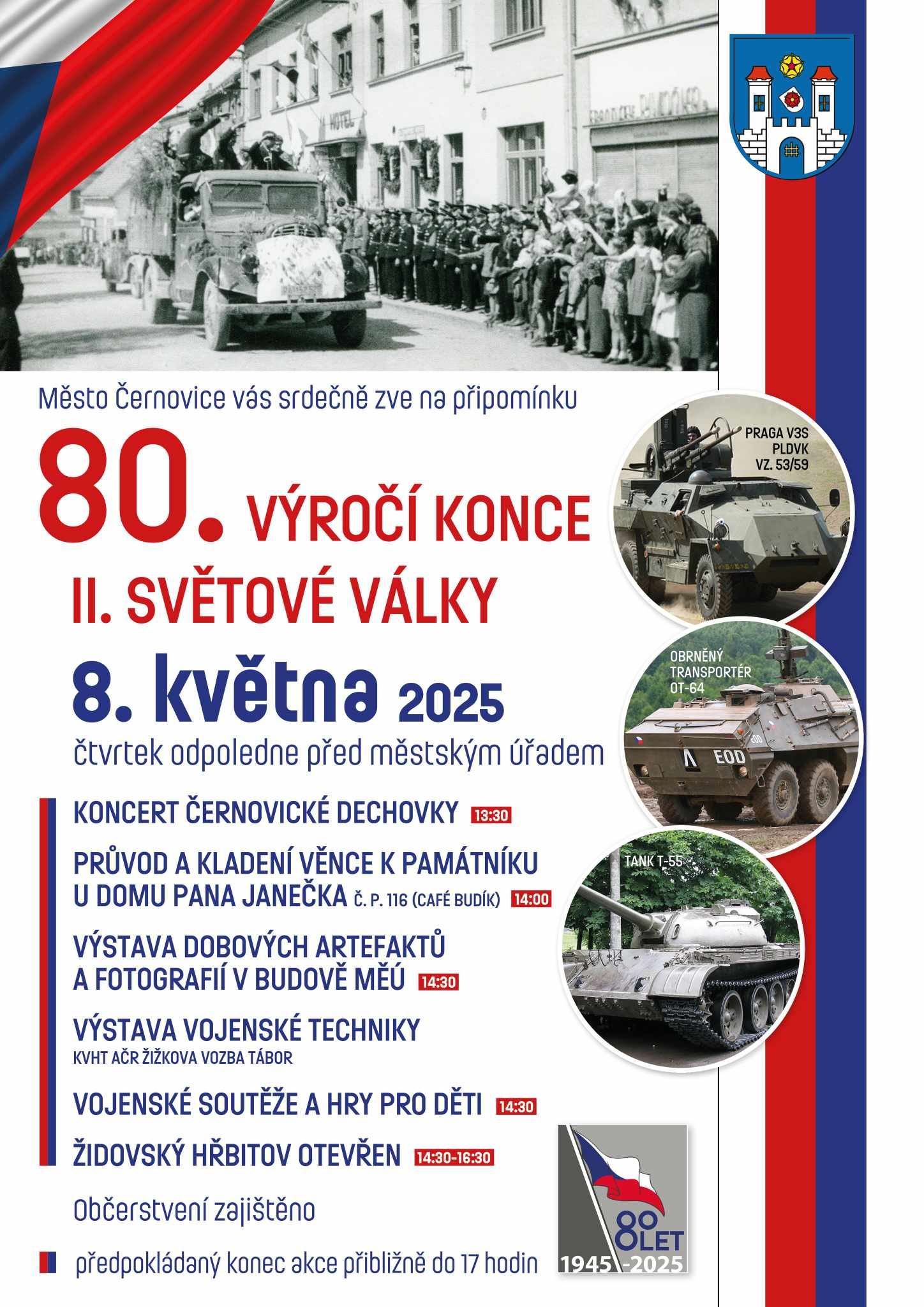 Město Černovice Vás srdečně zve na připomenutí výročí 80. let od konce 2.sv. války. Kladení věnce, výstava artefaktů a fotografií, výstava vojenské techniky, hry pro děti a další.