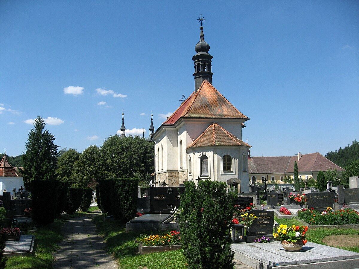 Opatský a hřbitovní kostel v jednom okruhu.