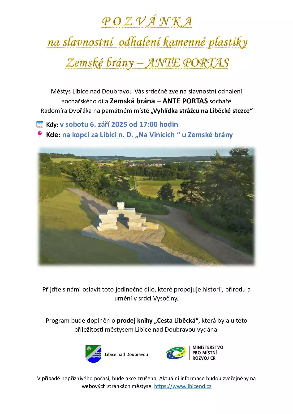 Městys Libice nad Doubravou Vás srdečně zve na slavnostní odhalení sochařského díla Zemská brána – ANTE PORTAS sochaře Radomíra Dvořáka na památném místě „Vyhlídka strážců na Liběcké stezce“