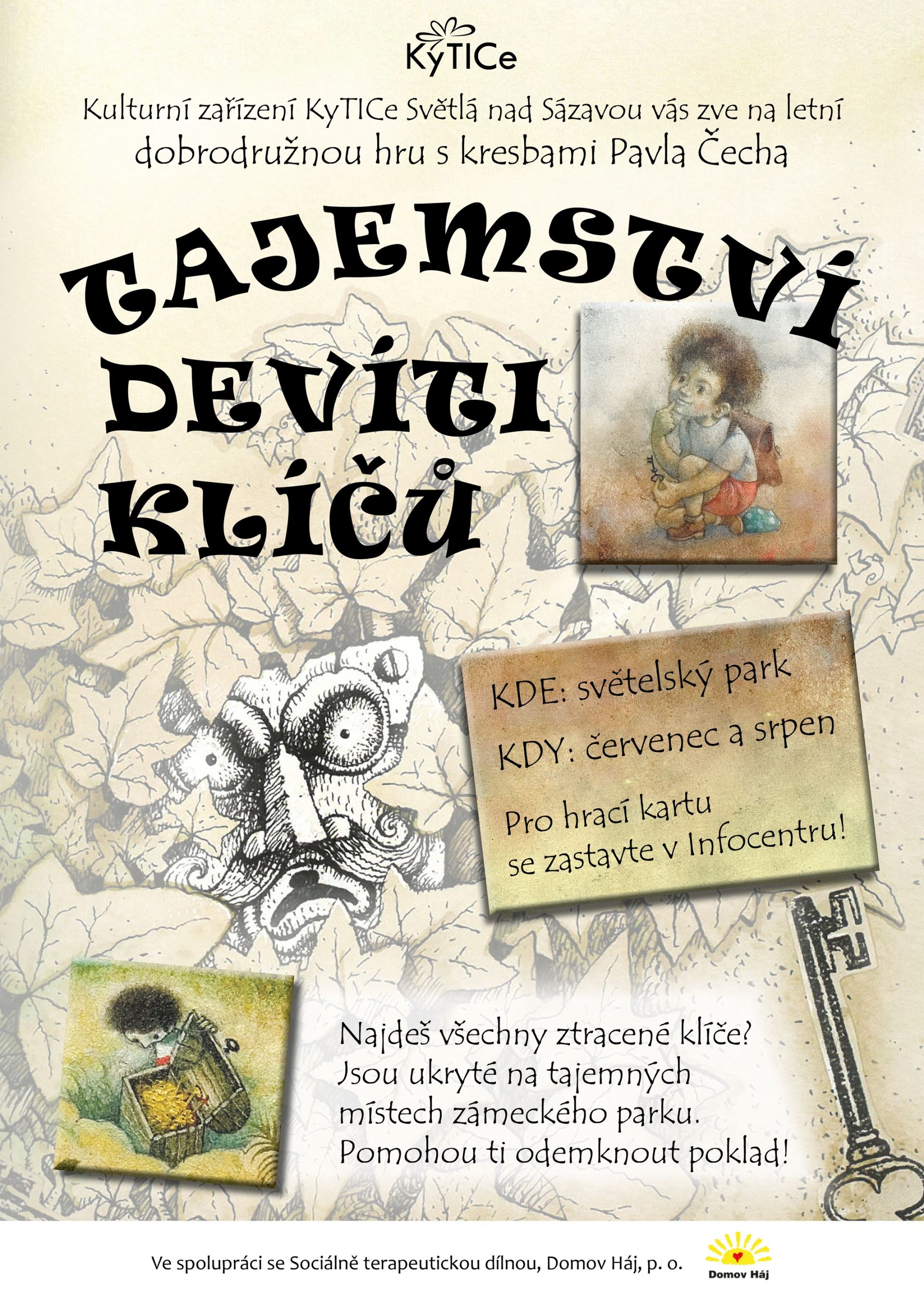 Autorem obrázků na panelech je mallíř Pavel Čech. Všechny obrázky najdeš v jeho knížkách: O klíči, O mráčkovi, O zahradě, O čertovi, Dobroružství pavouka Čendy a Dobroudružství Rychlé Veverky. Některé z nich si můžeš půjčit ve světelské knihovně nebo zakoupit v Infocentru po celé léto.