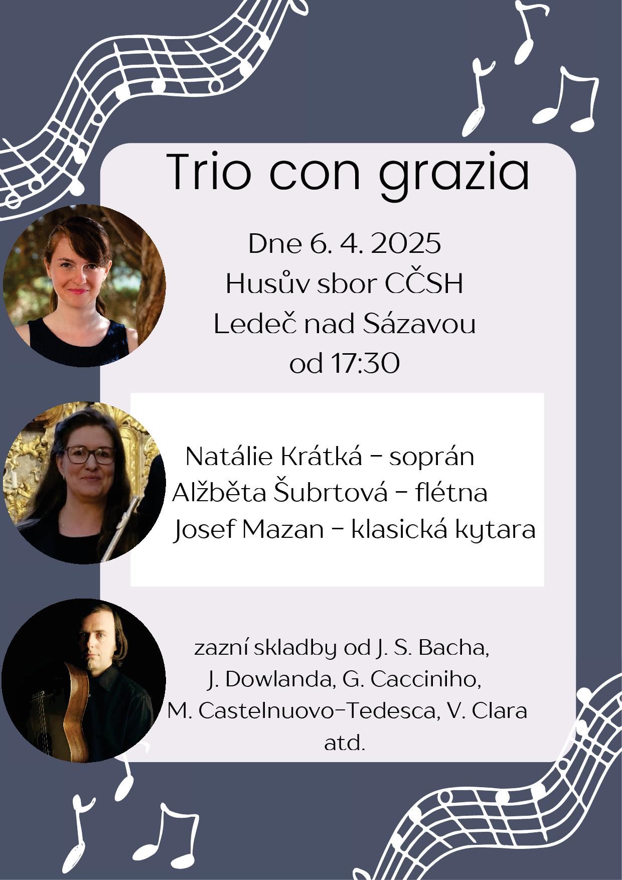 Trio con grazia je soubor složený z mladých hudebních profesionálů. Kombinace zpěvu, flétny a klasické kytary nám umožňuje vystavět program plný překvapení a kontrastů. Během našeho vystoupení kombinujeme zvuk celého tria, duetu zpěv – kytara i sólové kytary.