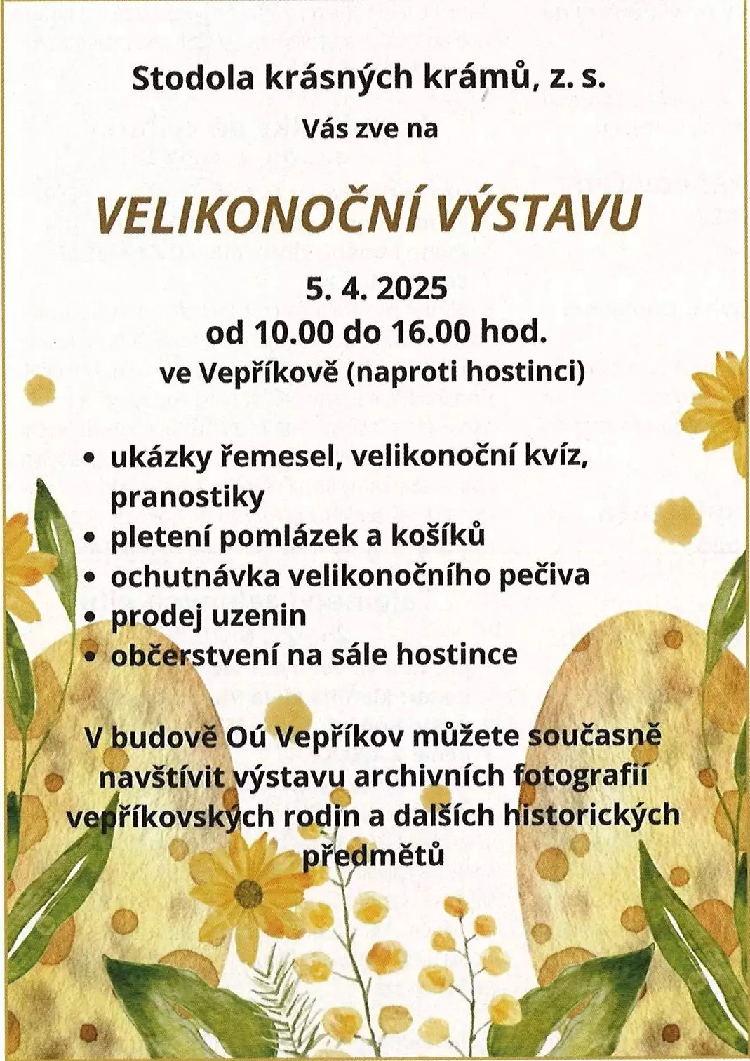 Vydejte se do Vepříkova, menší obce, která se pyšní Stodolou krásných krámů, kde proběhne letošní Velikonoční výstava. Těšte se na ukázku řemesel a prodej různých produktů. Nechybí ani ochutnávka zabijačkových produktů, prodej mléčných výrobků, pomlázek a košíků.