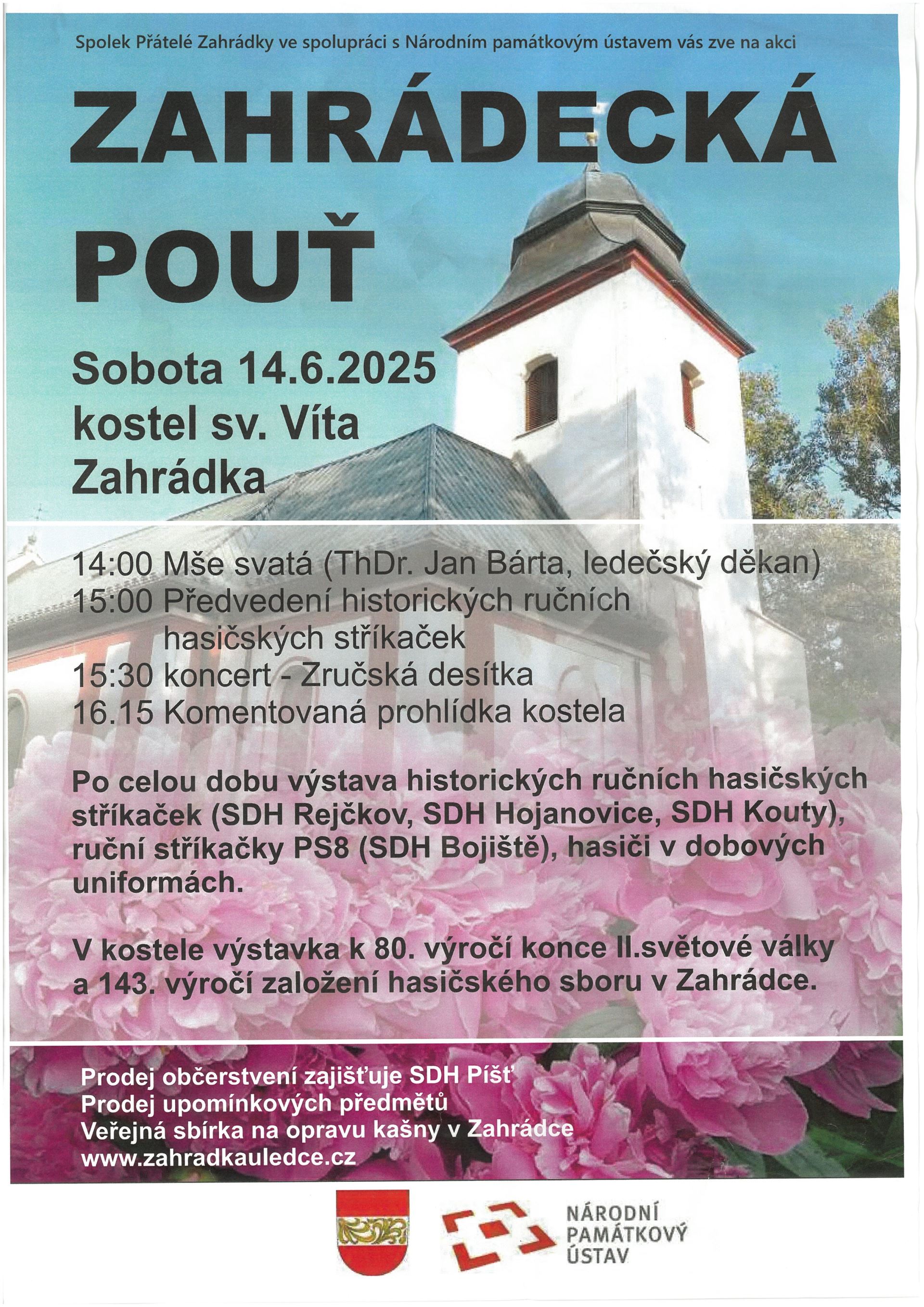 Přidat do oblíbenýchVydej se na pouť ke sv. Vítu do zatopeného městečka Zahrádka! Kromě duchovního programu je připraven i program kulturní - předvedení historických ručních hasičských stříkaček, koncert v podání Zručské desítky nebo komentovanou prohlídku kostela.