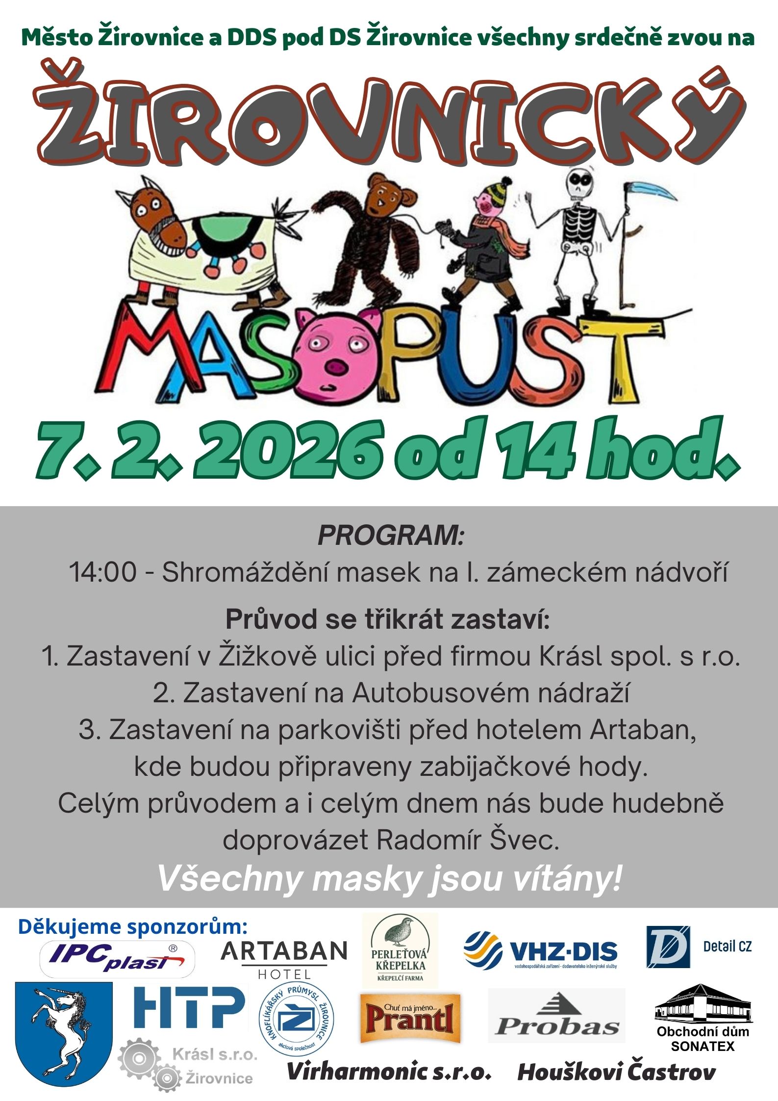 Zakončení před hotelem Artaban, kde budou připraveny zabijačkové hody a na sále k tanci i poslechu zahraje skupina Šmidliboys. Celým průvodem bude na harmoniku doprovázet Radomír Švec.