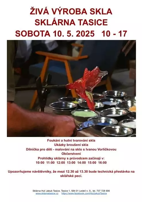 Nenechte si ujít jedinečnou možnost na vlastní oči vidět ukázky foukání a hutnutí tvarování skla, ukázky broušení skla, dílničky pro děti - malování na sklo s Ivanou Vorlíčkovou a další pestrý program.