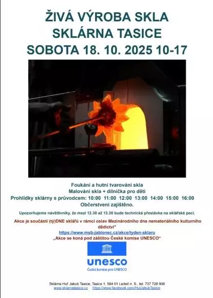 Zveme Vás na Živou výrobu skla ve sklárně Tasice! Těšte se na den plný fascinujících okamžiků, kdy budete moci nahlédnout do uměleckého řemesla tvorby skla.