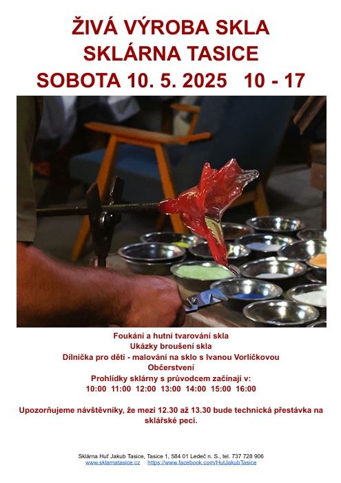 Nenechte si ujít jedinečnou možnost na vlastní oči vidět ukázky foukání a hutnutí tvarování skla, ukázky broušení skla, dílničky pro děti - malování na sklo s Ivanou Vorlíčkovou a další pestrý program.