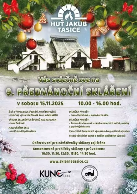 Nenechte si ujít jedinečnou možnost na vlastní oči vidět ukázky foukání a hutnutí tvarování skla, ukázky broušení skla, dílničky pro děti - malování na sklo s Ivanou Vorlíčkovou a další pestrý program.