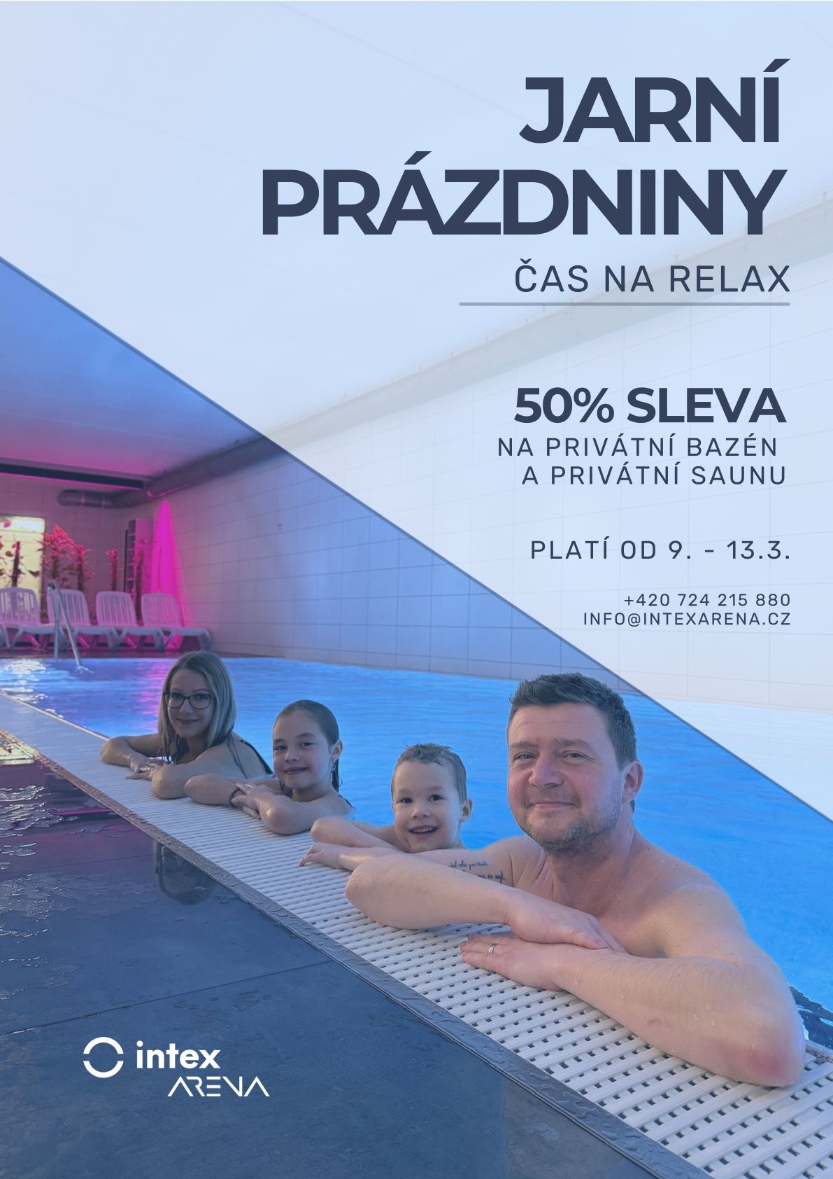 Přidat do oblíbenýchHledáte tip, jak si užít jarní prázdniny opravdu naplno? Dopřejte si zasloužený odpočinek v Intex aréna – a to s mimořádnou slevou 50 % na privátní bazén a saunu v termínu od 9. - 13. 3. 2026.