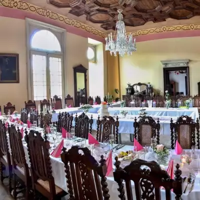Stejně jako pro obřad, tak i pro svatební hostinu je možná venkovní i vnitřní varianta. Letní svatby zpravidla volí hostinu na zámeckém nádvoří, kde je zároveň instalovaný menší svatební parket, a tak na hostinu plynule navazuje první tanec, házení svatební kytice a další oslavy. Pro vnitřní variantu jsou k dispozici dva slavnostní sály, Rytířský a Erbovní, které je možné propojit prostřednictvím velkých dveří.