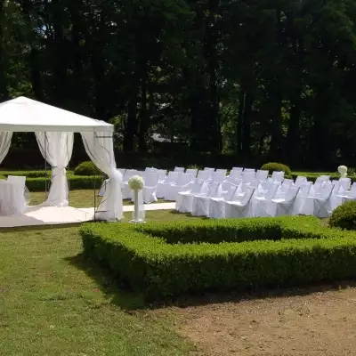 Svatební obřad se může konat buď venku v zámeckém parku, nebo uvnitř zámku. Většina svateb využívá možnost venkovního obřadu v romantickém francouzském parku. V případě nepřízně počasí si pak snoubenci vybírají mezi vysvěcenou zámeckou kaplí a Rytířským sálem.